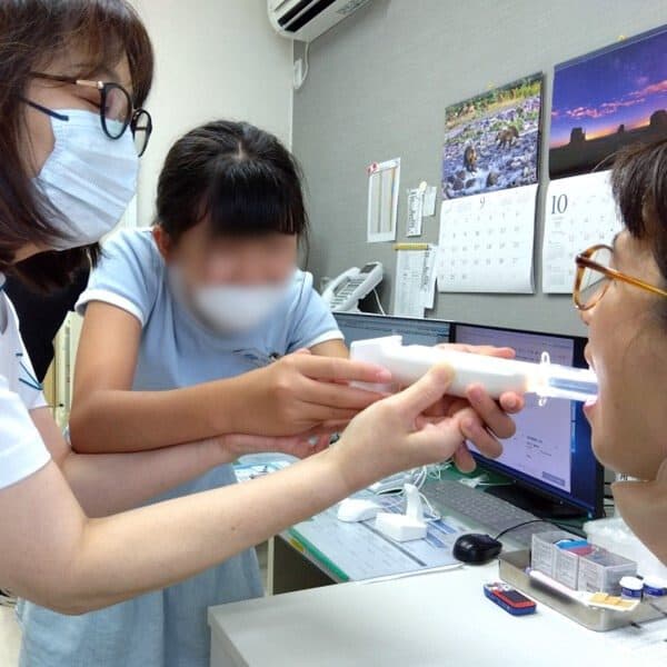 口を開けてもらうだけで、カメラが喉の写真を撮影し、AIがインフルエンザの有無を判定してくれる革新的な検査なんですよ。」