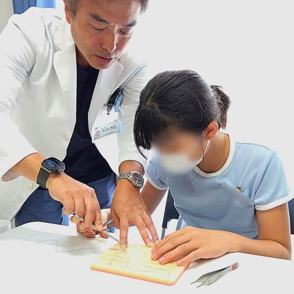 参加者は、本物の診療機器を使った検査体験では『レントゲン検査』『エコー(超音波)検査』『nodoca®』「血糖値測定」に挑戦し、そして今回は外科医師などに必要不可欠な縫合技術をマスターする際に使用する縫合パットと本物の縫合針と糸を使った縫合体験にも挑戦します。