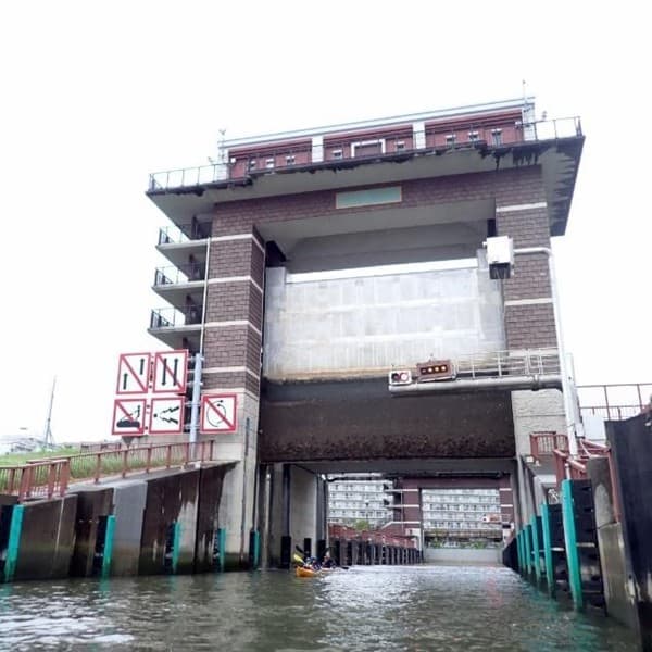 「荒川ロックゲート」を目指して漕ぎ進むと、突如として巨大な建物が視界の前に立ちはだかります。 先生から「これが荒川ロックゲートです!」との案内があり、さらに「先ほど触れた海抜ゼロメートル地帯の工夫が、この中に入るとよく分かりますよ。さあ、進みましょう!」と声がかかります。 参加者はその言葉に導かれ、圧倒的な存在感を放つ門をくぐり、中へと進んでいきます。
